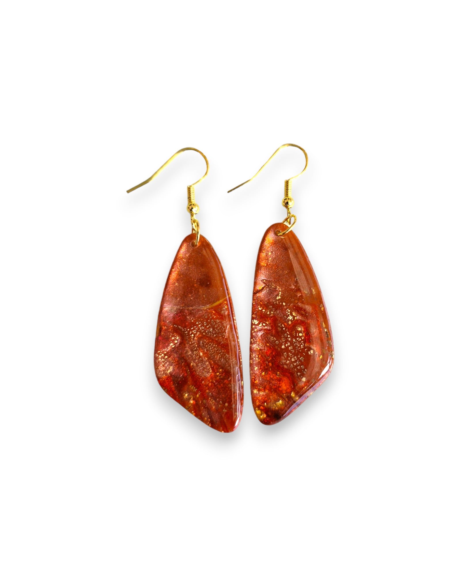 These Rich Amber coloured earrings with layers of autumn colours are made from polymer clay and other secret ingredients with a sparkly resin finish on the back. As they sway in the breeze, the hidden depths with be revealed with plenty of shimmer and sparkle.