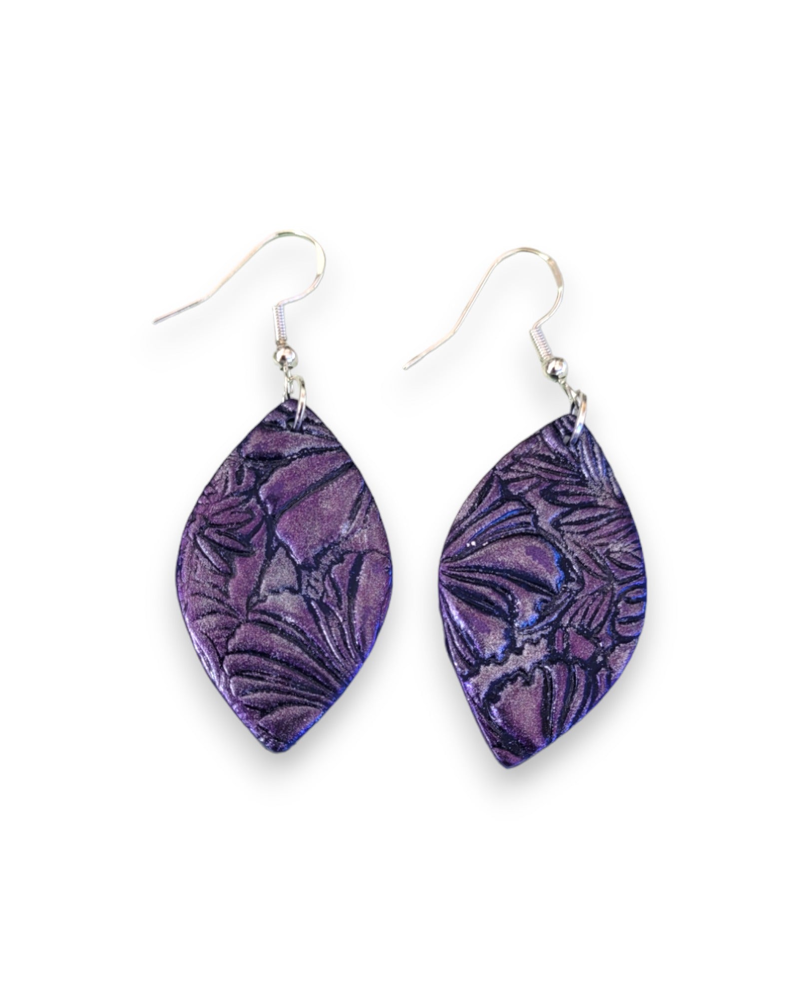 These Blue and Lavender textured earrings are made from polymer clay with a lacquer finish on the front and a sparkly resin finish on the back. As they sway in the breeze, different colours will shimmer