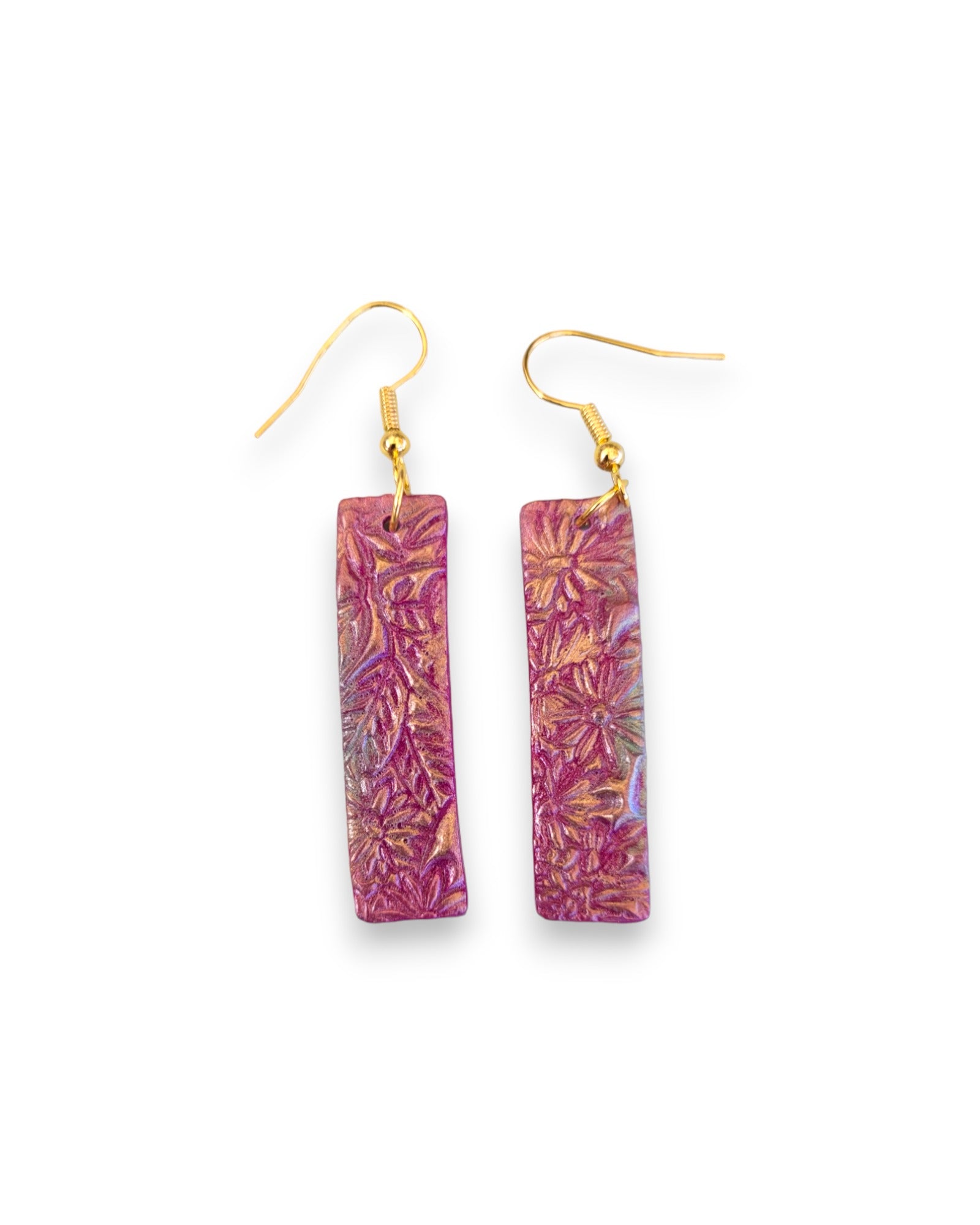 These Magenta and multicolored textured earrings are made from polymer clay with a lacquer finish on the front and a sparkly resin finish on the back. As they sway in the breeze, the multicolor colours will shimmer.