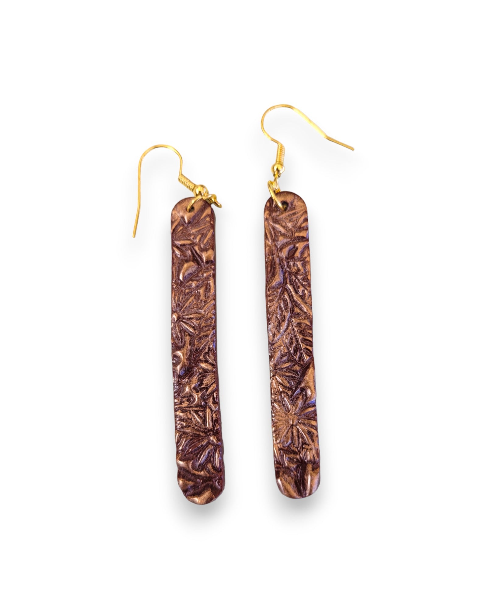 These Chocolate brown and Gold textured earrings are made from polymer clay with a lacquer finish on the front and a sparkly resin finish on the back. As they sway in the breeze, the gold colour will shimmer.