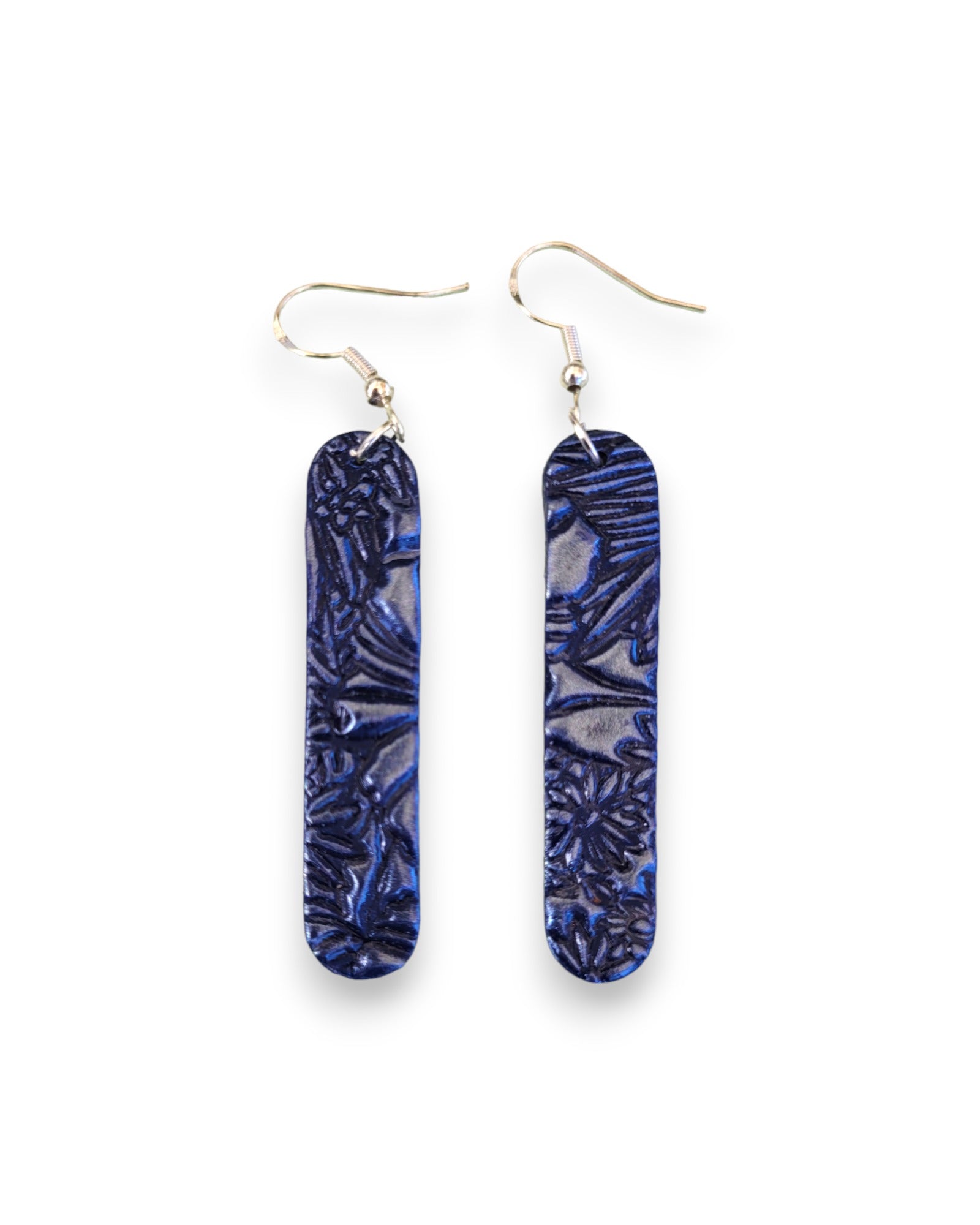 These Blue and Silver textured earrings are made from polymer clay with a lacquer finish on the front and a sparkly resin finish on the back. As they sway in the breeze, the silver colour will shimmer.
