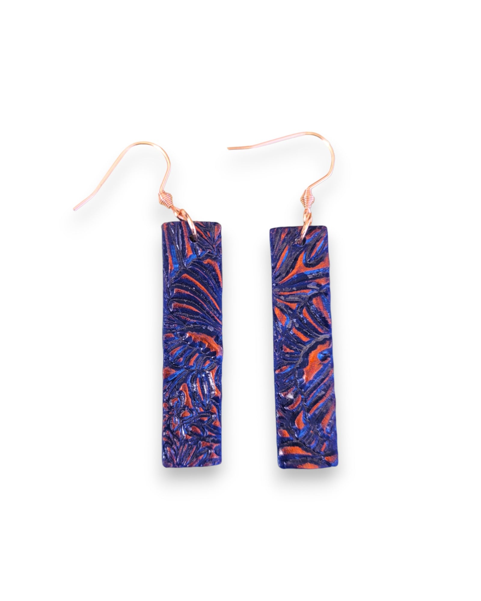 These Blue and Copper textured earrings are made from polymer clay with a lacquer finish on the front and a sparkly resin finish on the back. As they sway in the breeze, the copper colour will shimmer.