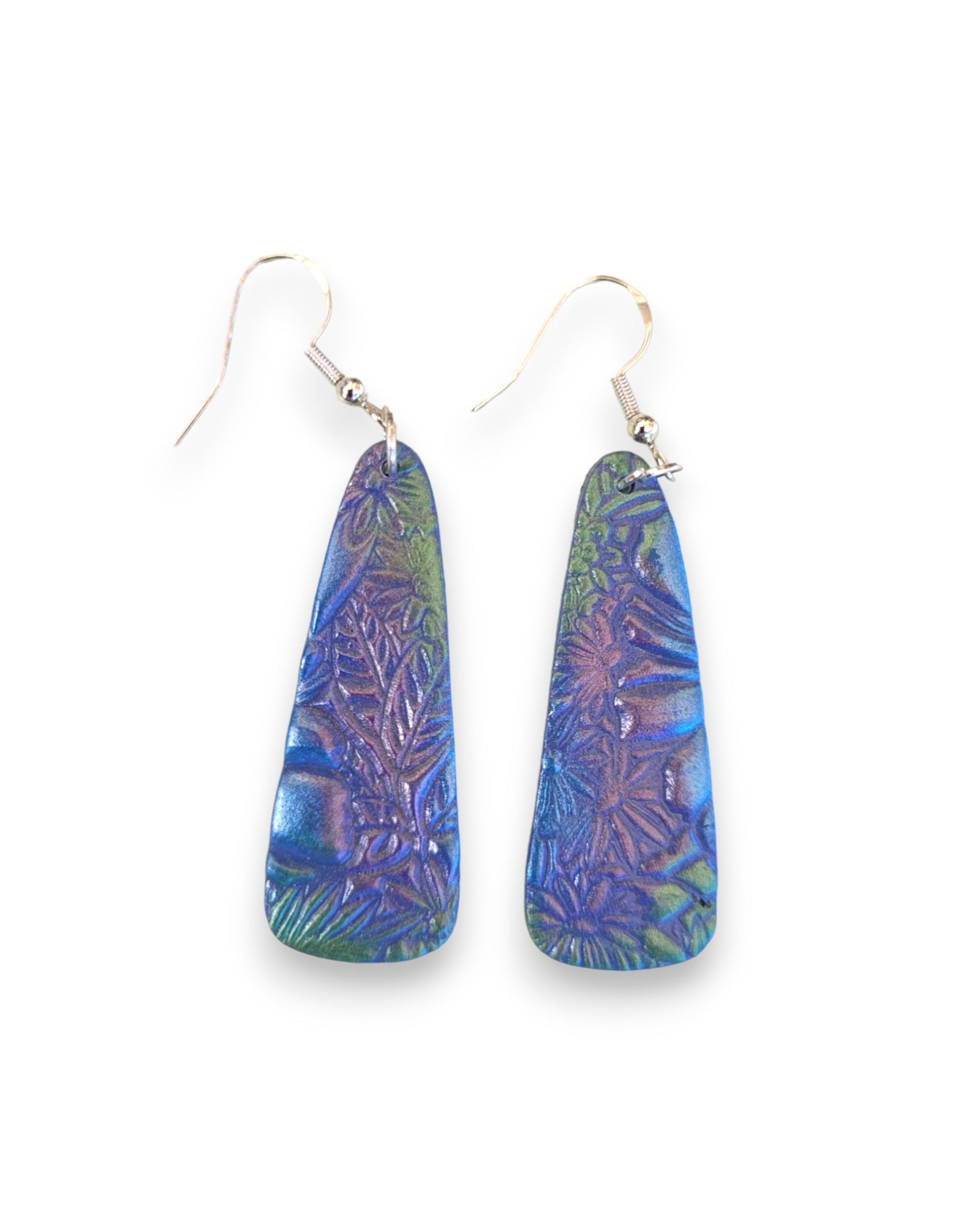 These Light Denim and multi coloured textured earrings are made from polymer clay with a lacquer finish on the front and a sparkly resin finish on the back. As they sway in the breeze, the multi colours will shimmer.