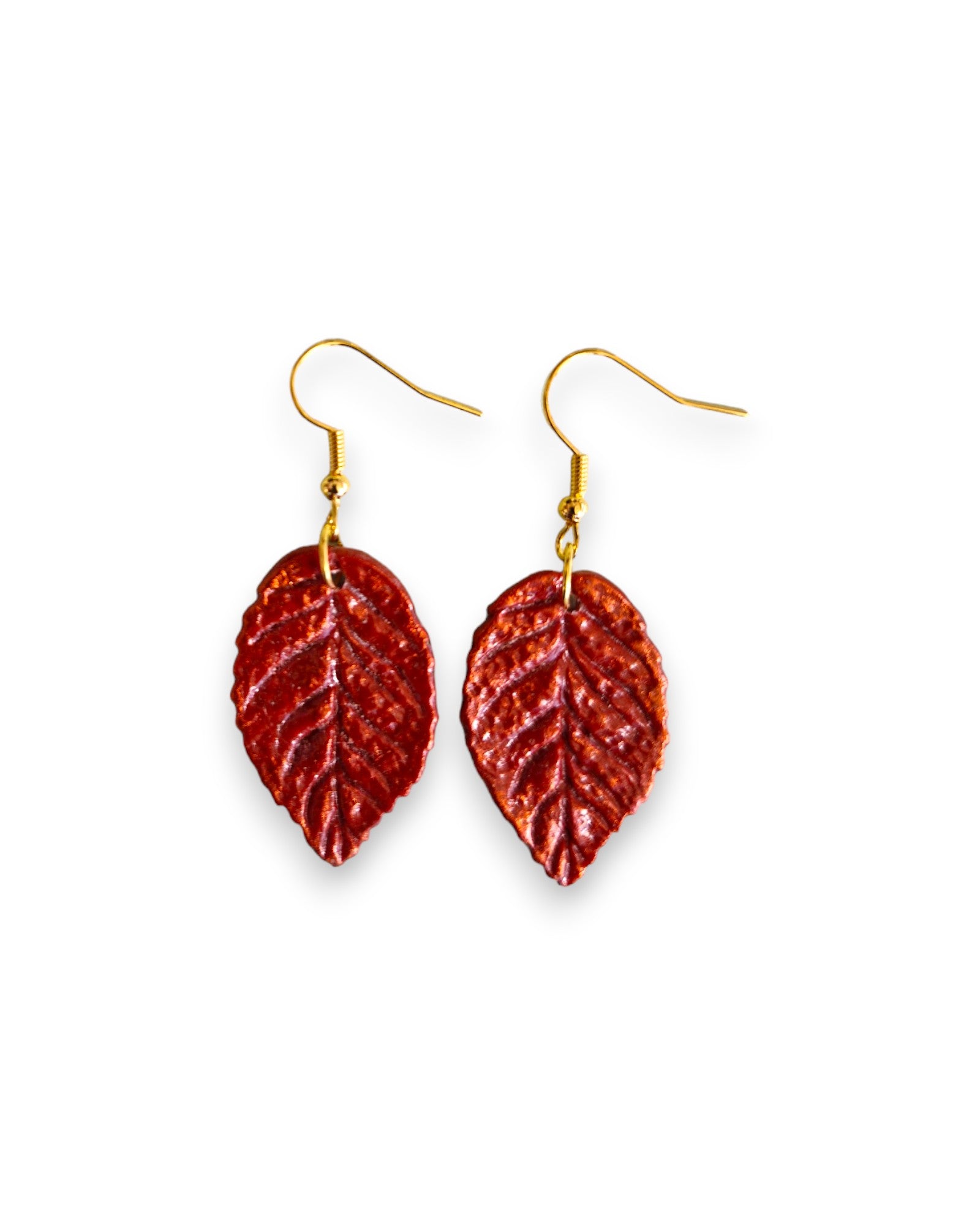 These Textured earrings have a shimmering copper finish. They are made from polymer clay with a lacquered finish on the front and a resin finish on the back. As they sway in the sun, the copper shimmer and texture will become more obvious.