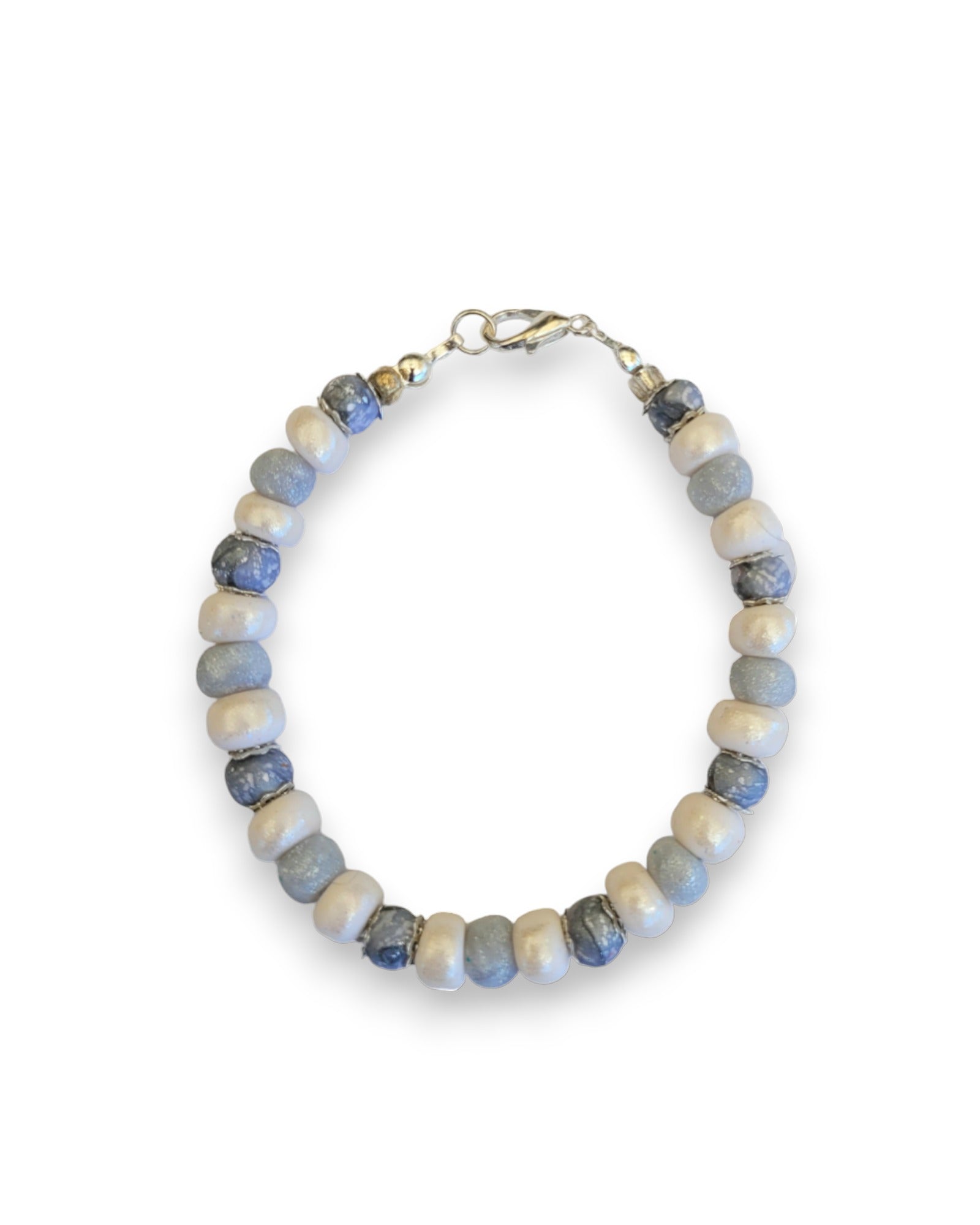 This lovely bracelet features handmade beads that are made from Polymer clay. Some additional spacer beads have been added to this piece to create this look.