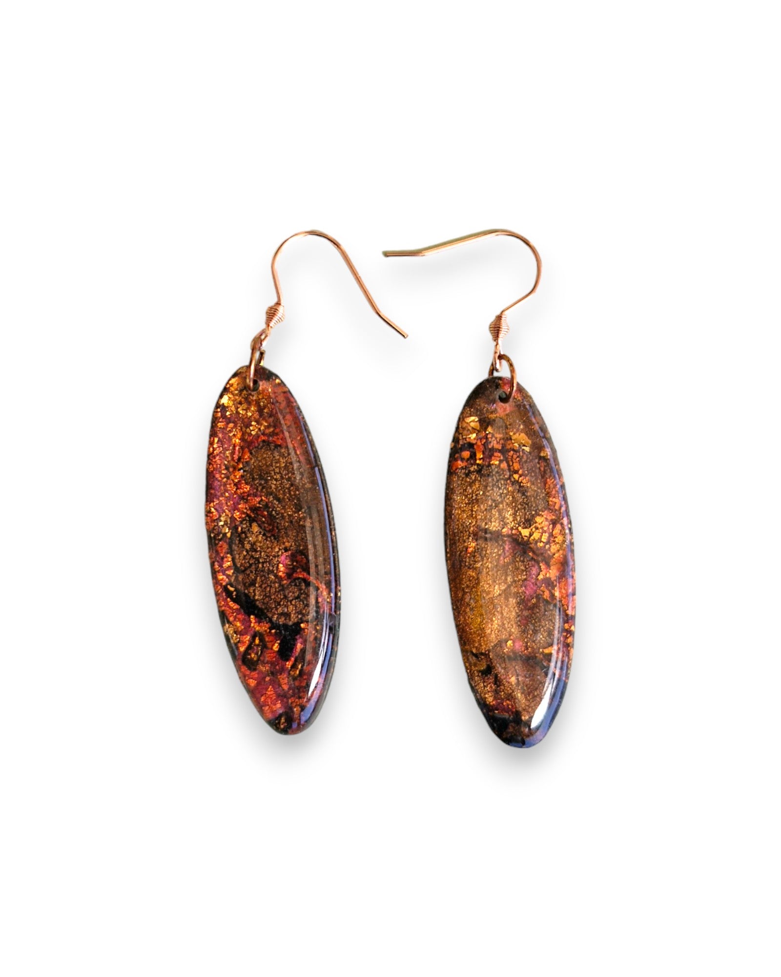 These Rich Autumn coloured earrings have rich copper sparkles among darker autumn colour tones. They are made from polymer clay and other secret ingredients with a sparkly resin finish on the back. As they sway in the breeze, the shimmer and sparkle be revealed.