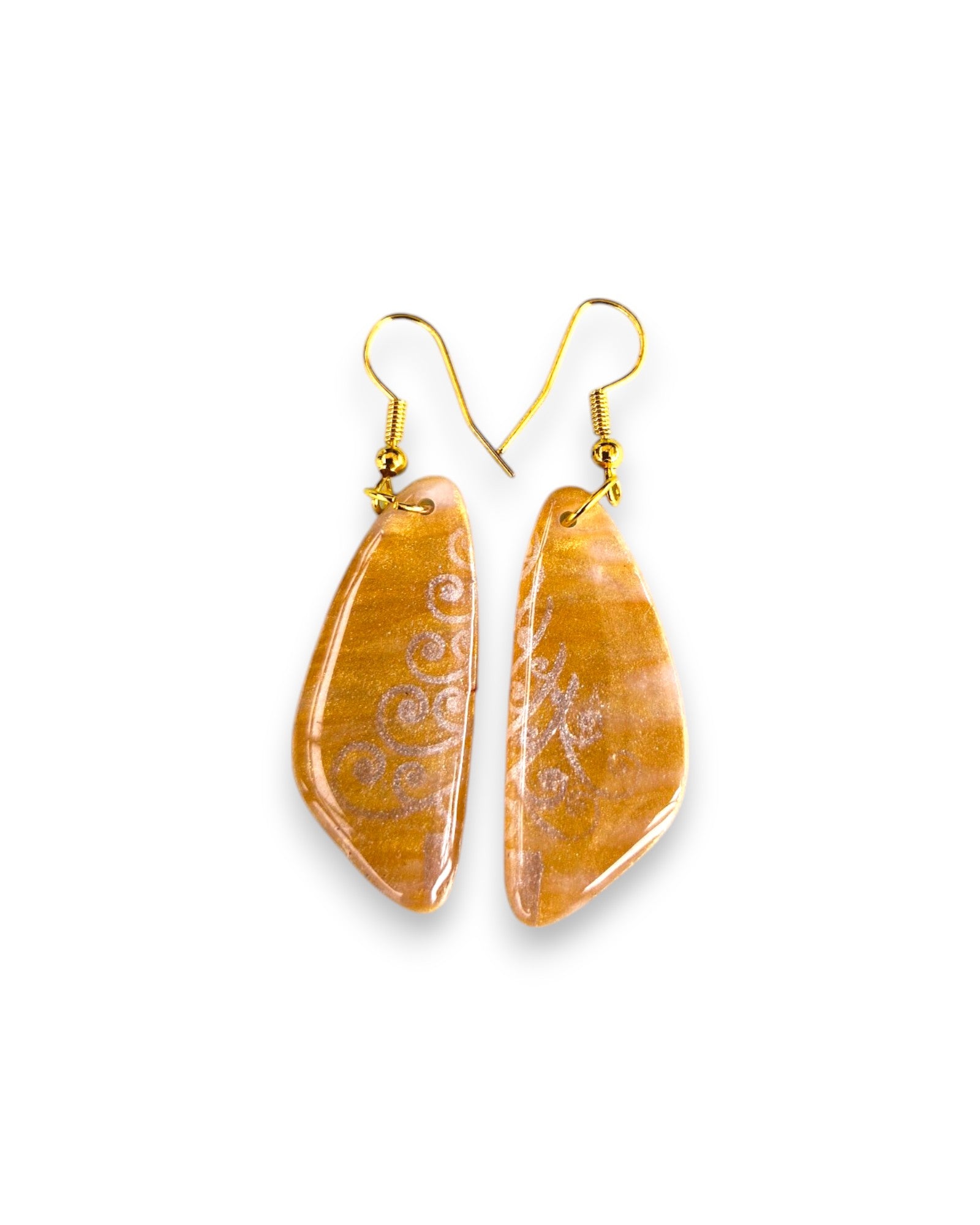 These earrings are similar to Whispering Christmas Tree and have a an elegant, slightly varied gold background with a whisper of a Christmas tree across both earrings. They are an elegant hint of Christmas that you may not notice at first glance. Perfect for a Christmas outfit when you want just a hint of elegant fun.