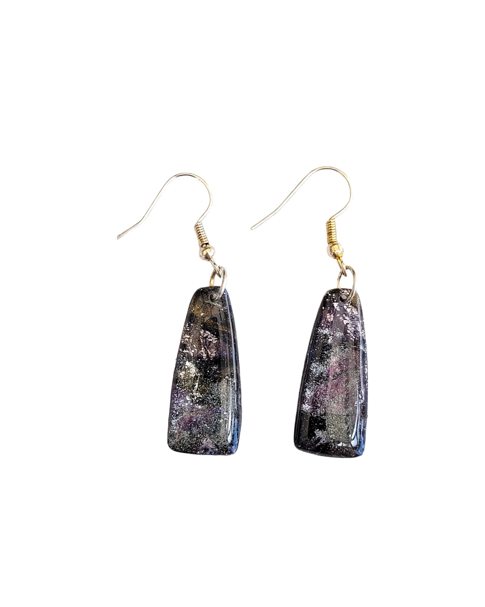These shimmering mini earrings are made from polymer clay with a resin finish. The shimmering black/multi colour design looks especially amazing in the light.