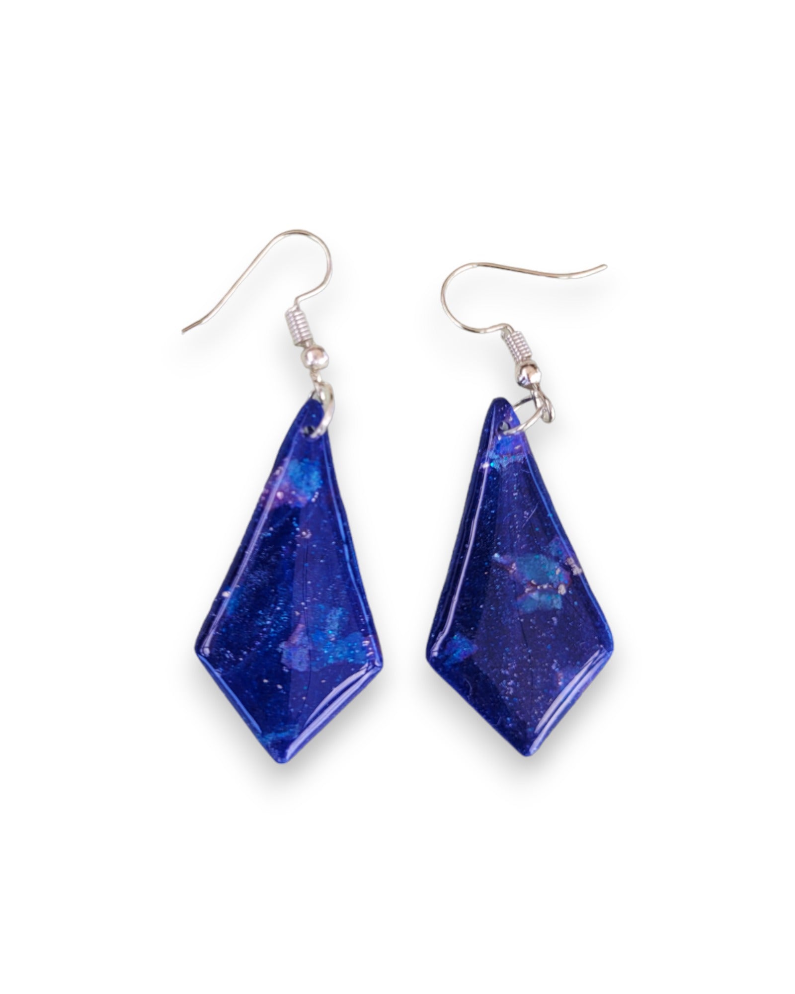 These multi blue coloured earrings are made from polymer clay with a resin finish. They have layers that sparkle and shimmers in the sunlight.