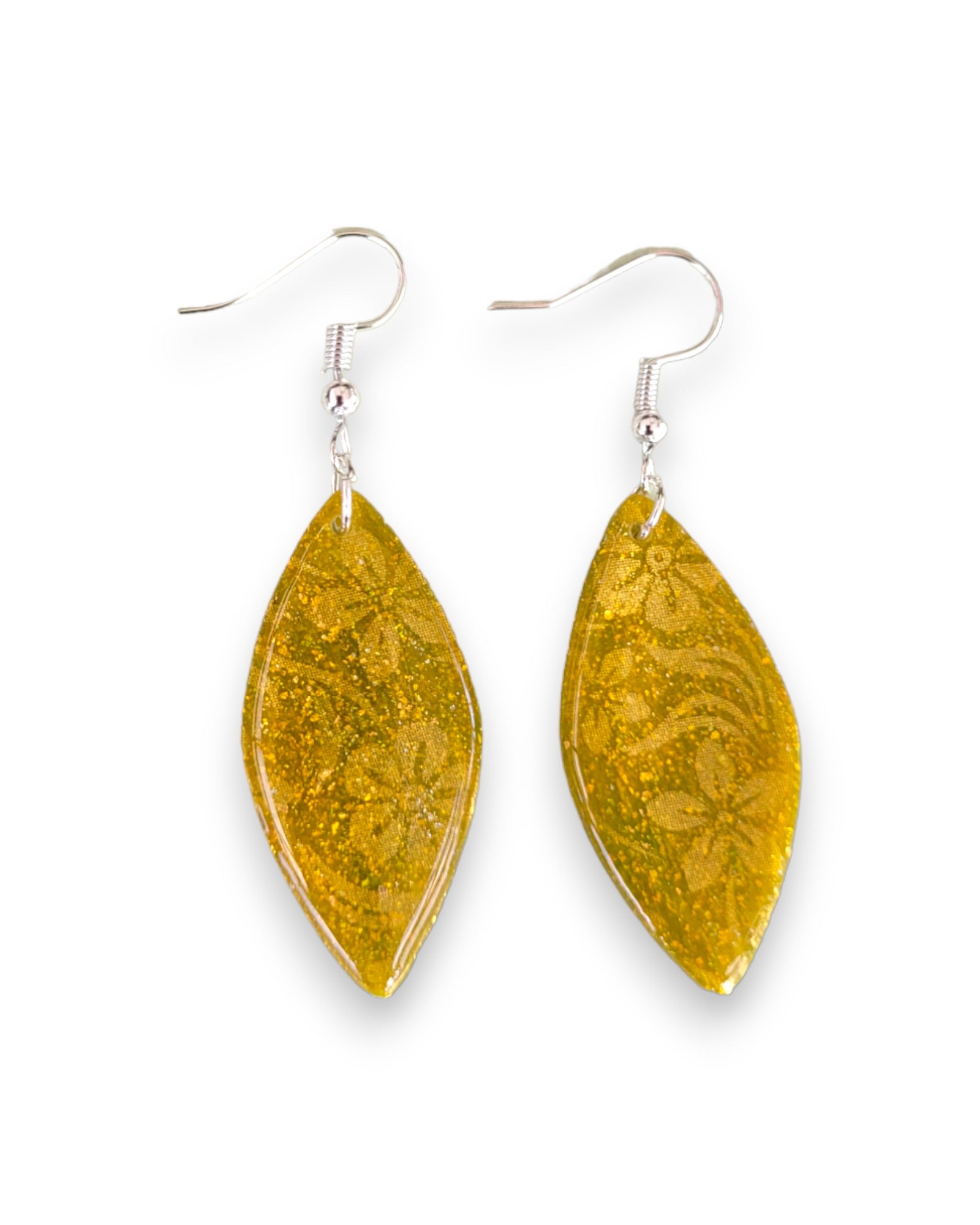 These mustard yellow coloured earrings are made from polymer clay with a resin finish. They layers that sparkle and shimmers in the sunlight.