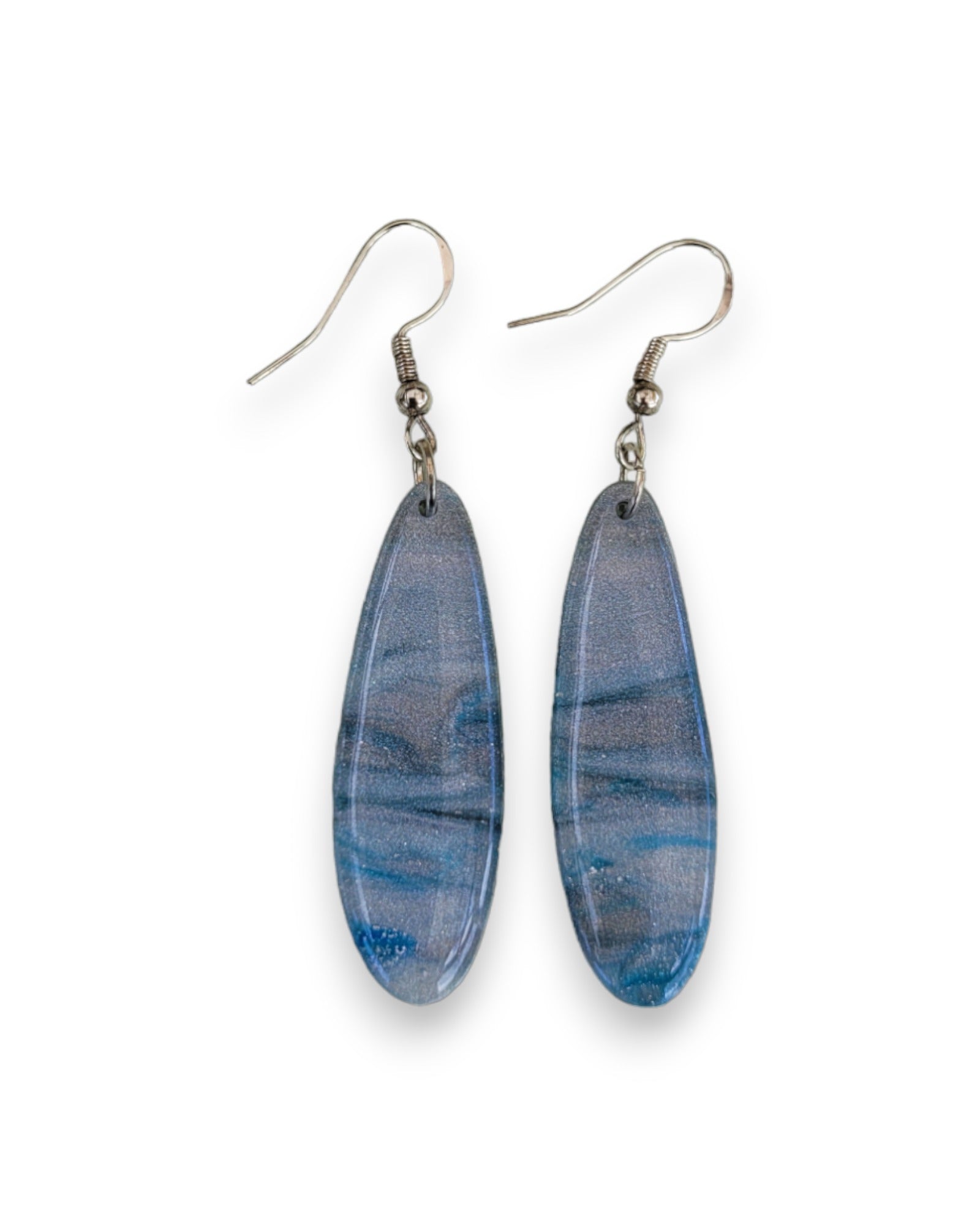 These blue and silver coloured earrings are made from polymer clay with a resin finish. They have plenty of shimmer in the sunlight.