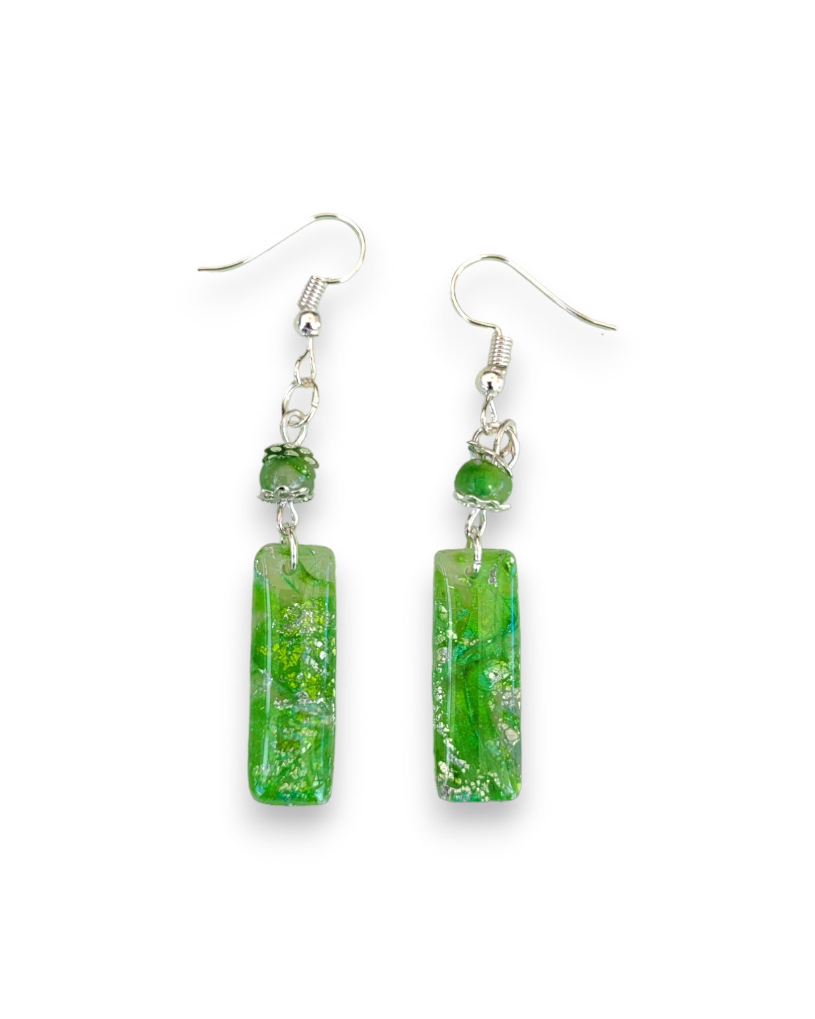These earrings are made from polymer clay with a resin finish. They feature a handmade bead with a lacquer finish and 2 added silver spacer beads.