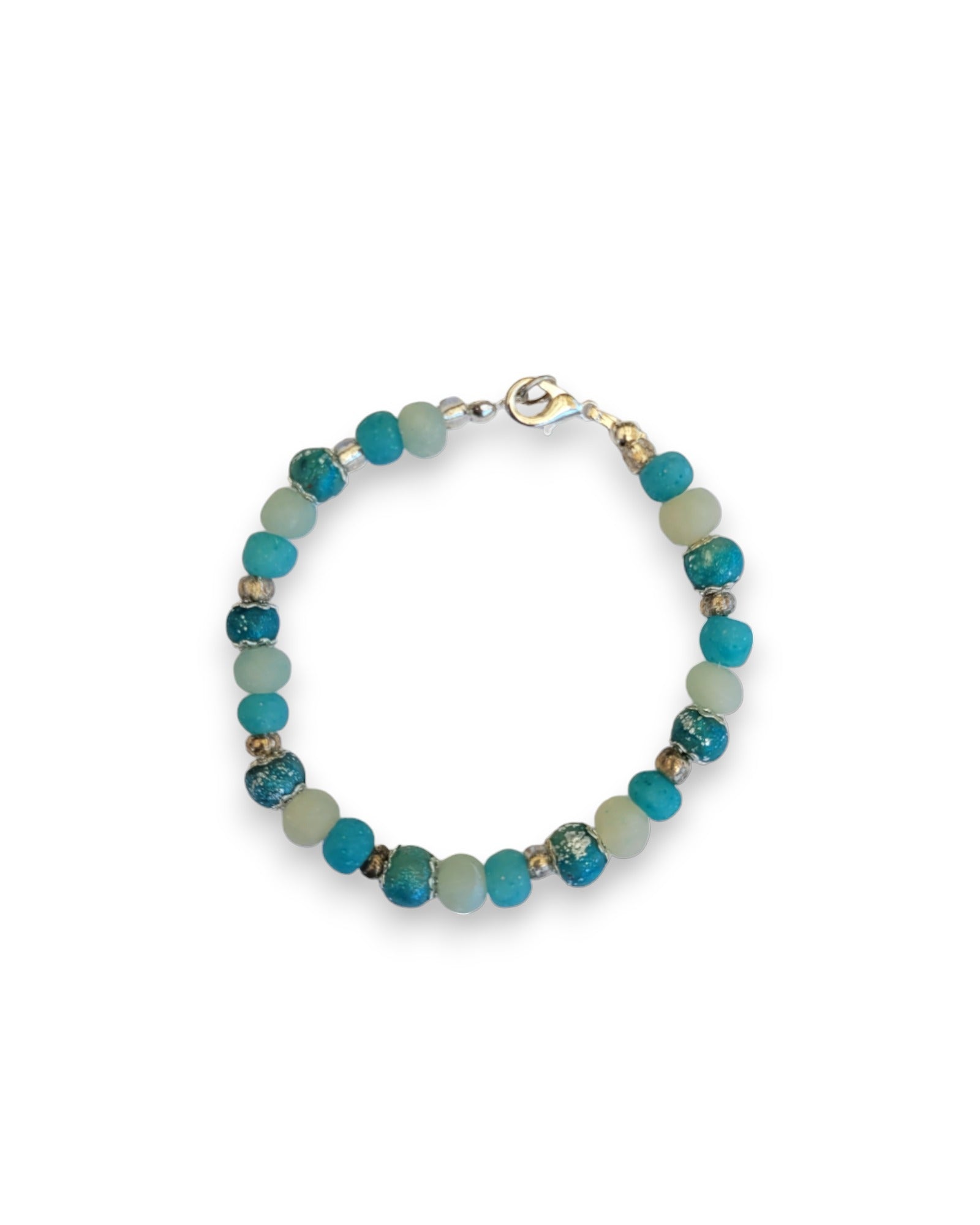 This bracelet features handmade beads that are made from Polymer clay. Some additional beads have been added to create this look.