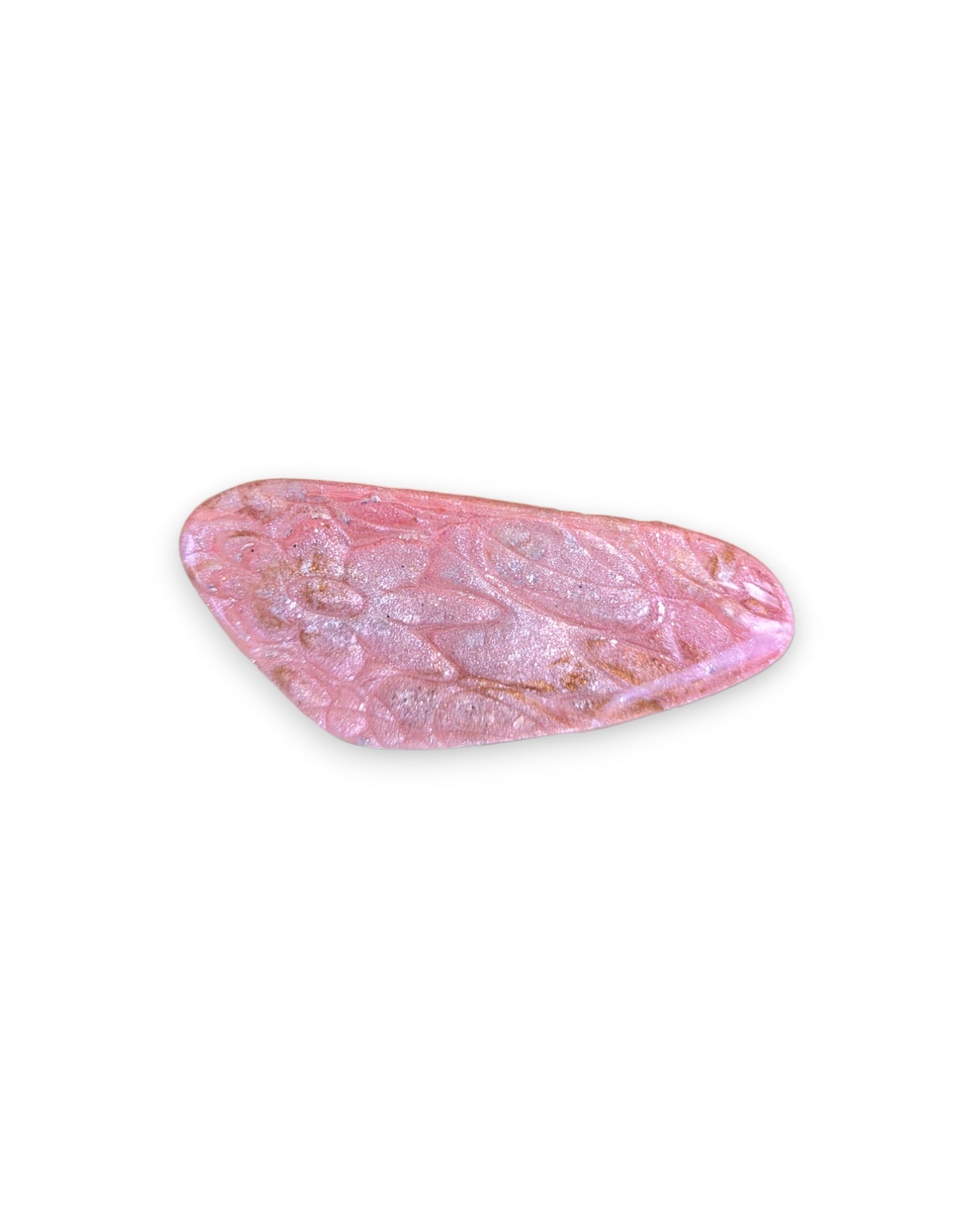 This brooch is made from polymer clay with a resin finish. It has a subtle petal like shimmer that looks great in the sun.
