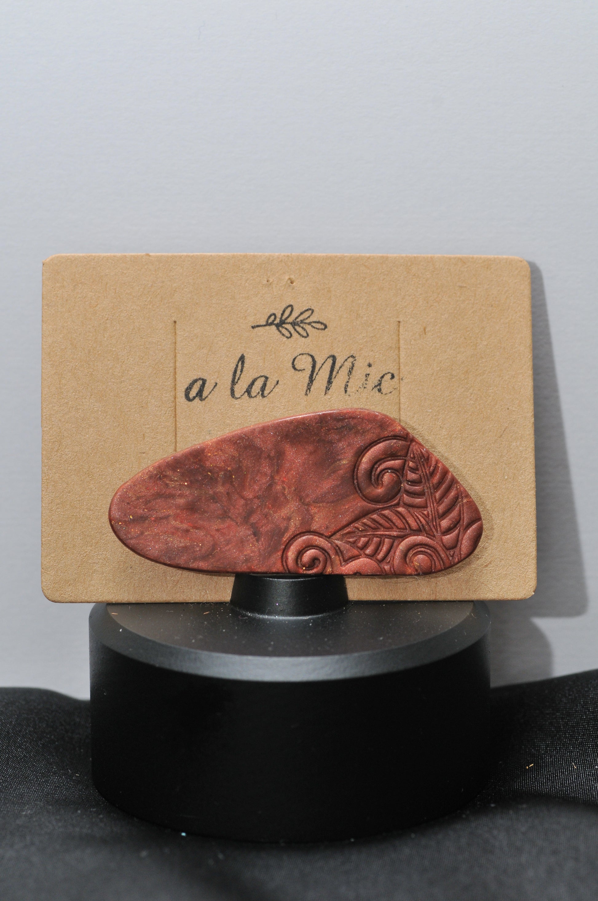 This brooch is made from polymer clay with a wax front finish and a resin back finish.