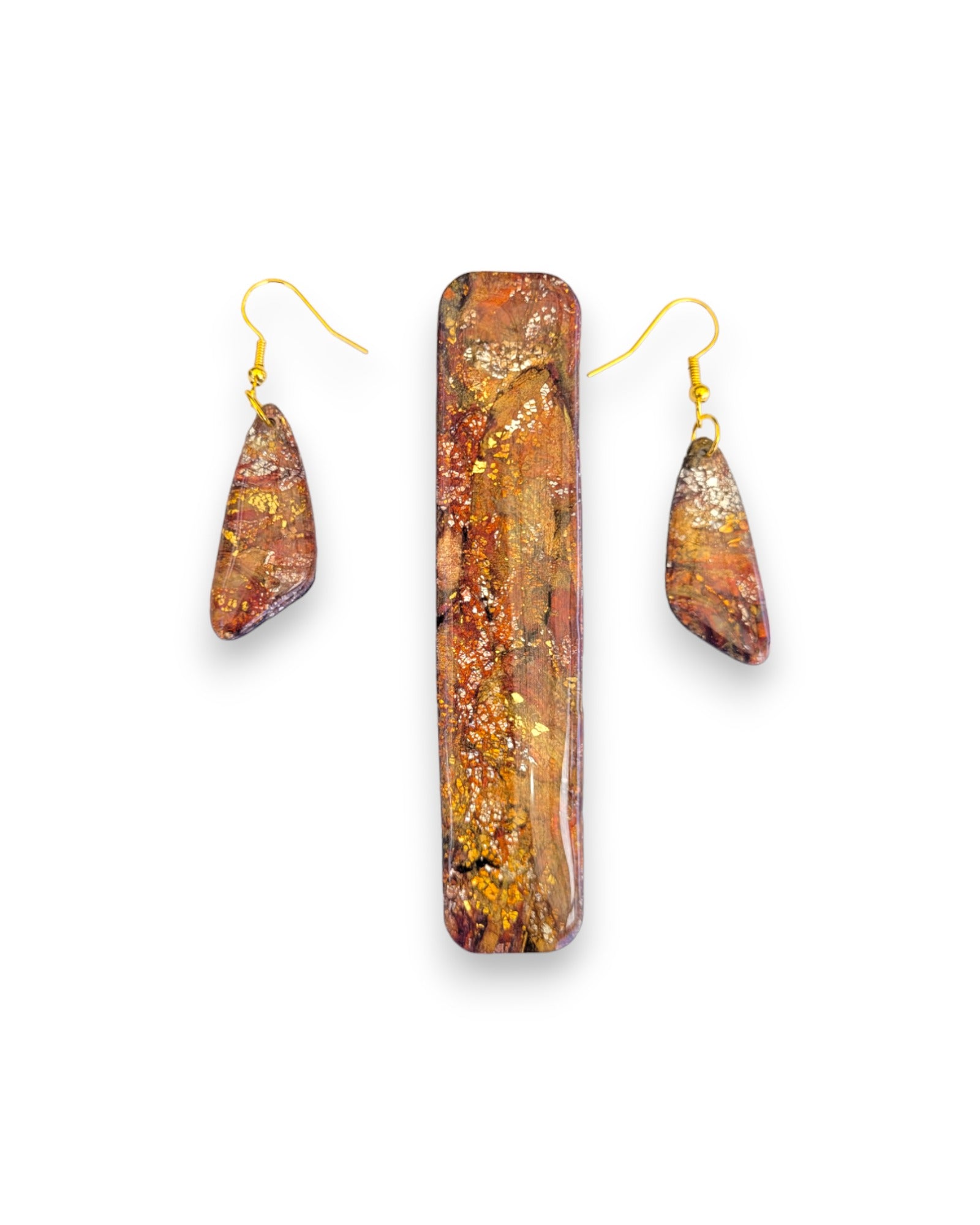 This Hairclip and earring set is made from polymer clay with a resin finish. This set has multiple autumn colour tones. When the light hits this set, the shimmer and sparkles take on a life of their own.