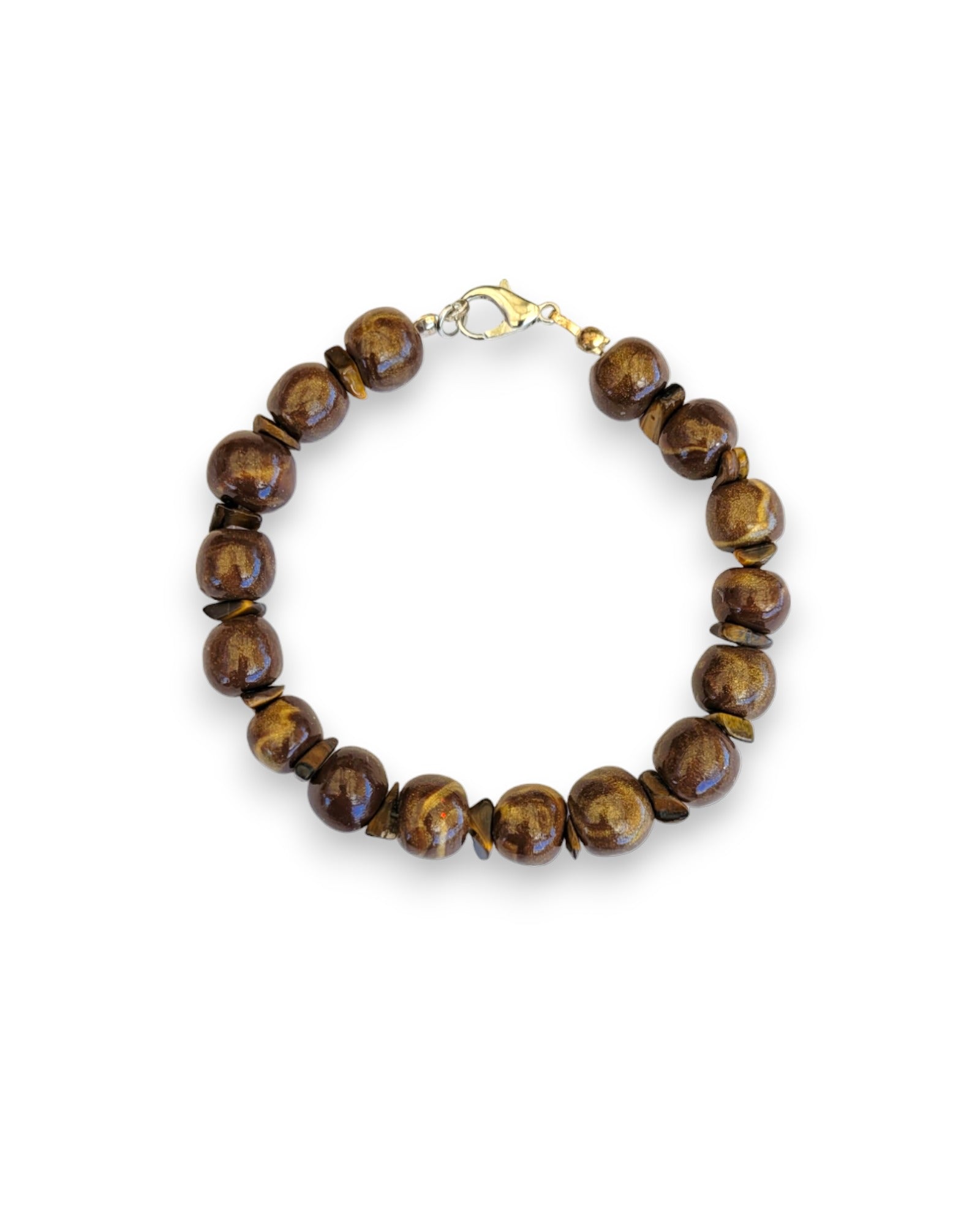 This bracelet features handmade beads that are made from Polymer clay. They have a gold tigers eye gemstone look to them that sparkles in the light. Some additional beads have also been added to this look.