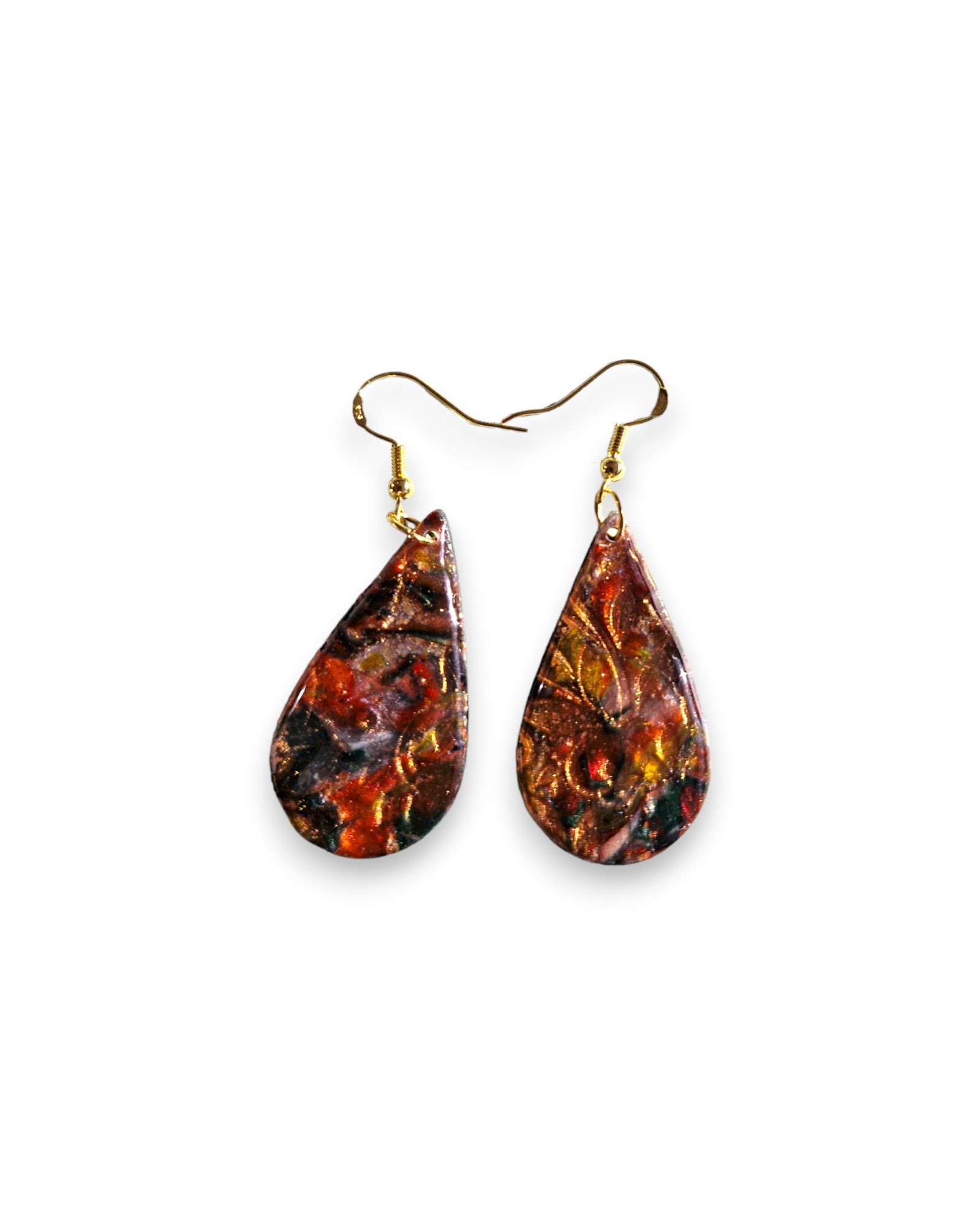 These earrings have lots of shimmering colour tones with a gold patterned finish. They remind me of a (Mid) Winters Christmas and all of the traditional colours or a rich Christmas tapestry.